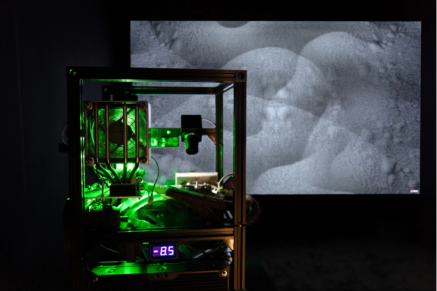Melting – the show must go on! aborde les changements climatiques dans l’ère de l'Anthropocène. L'installation transforme la fonte des glaciers en une expérience esthétique et acoustique, tout en questionnant la consommation énergétique considérable du monde numérique qui contribue de manière significative au réchauffement climatique.