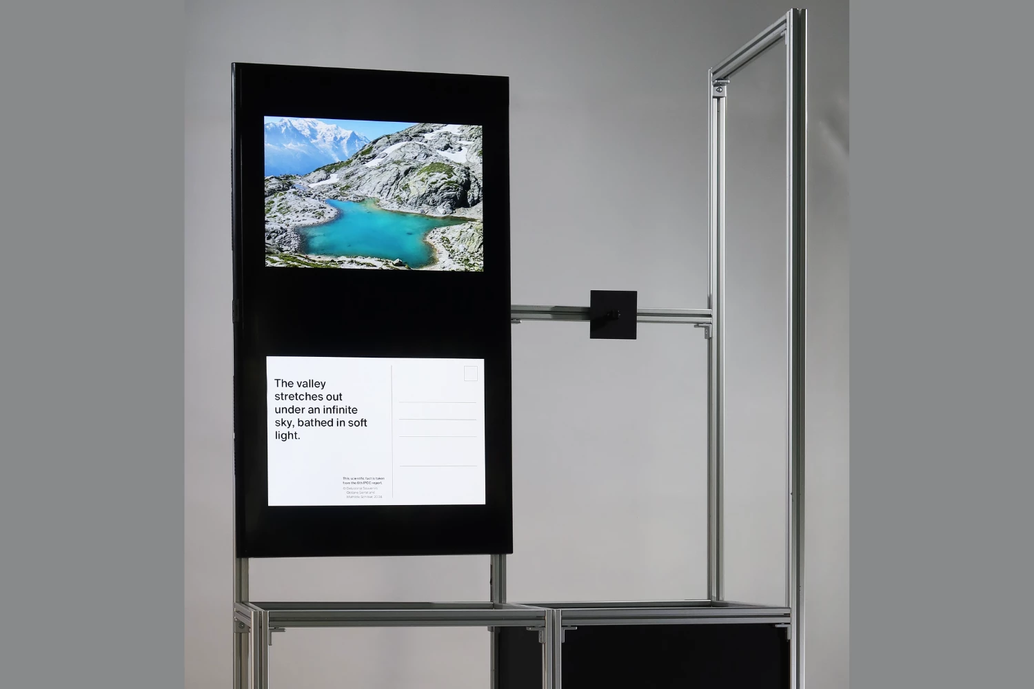 L’installation propose la génération d’une carte postale à partir d’images et de textes issus de moteurs de recherche, reproduisant les clichés touristiques de la montagne et, plus précisément, des Alpes, qui façonnent notre imaginaire collectif.