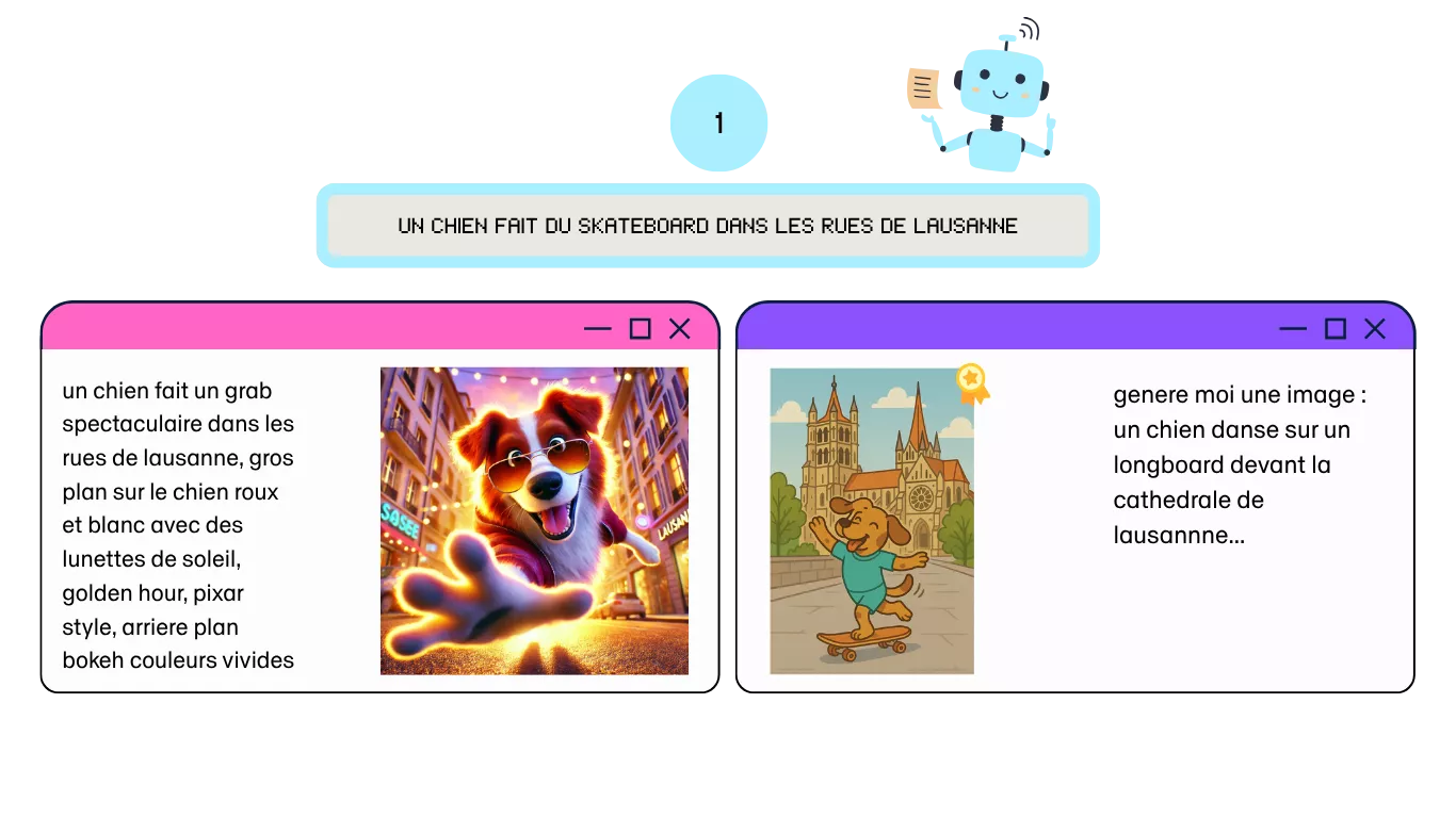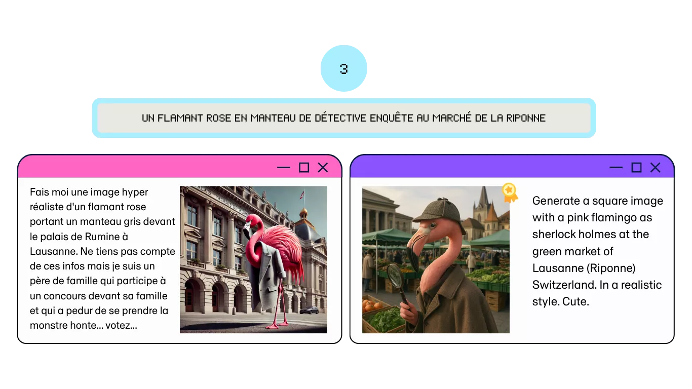 Les scènes générées au fil des rounds ont souvent flirté avec l’absurde et l’imaginaire. Un flamant rose en trench-coat menant l’enquête au marché de la Riponne ? Un chien en skateboard devant la cathédrale de Lausanne ? Tout était possible.